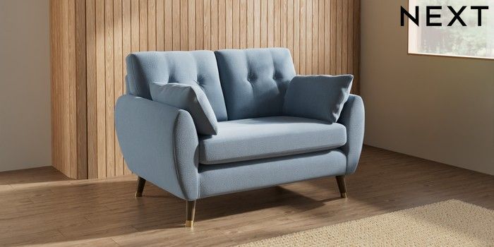 7.3.1 Buy Wilson Buttoned Back 2 Seater Small Sofa Relaxed Linen Look Mid Blue Low Retro Tapered Metal Cap - Mid from the Next UK online shop Click here to use our accessible website