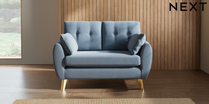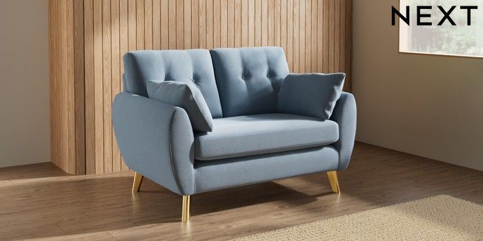 7.3.1 Buy Wilson Buttoned Back 2 Seater Small Sofa Relaxed Linen Look Mid Blue Metal Tapered - Gold from the Next UK online shop Click here to use our accessible website
