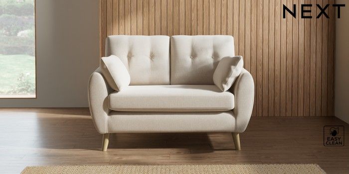 7.2.10 Buy Wilson Buttoned Back 2 Seater Small Sofa Tweedy Blend Easy Clean Oyster Retro Tapered - Light from the Next UK online shop Click here to use our accessible website