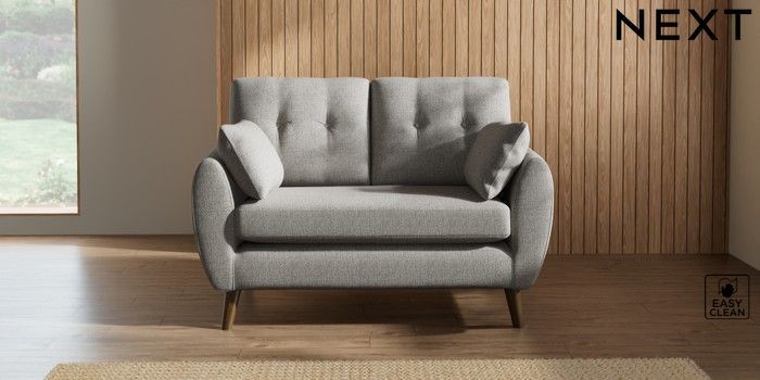 7.2.10 Buy Wilson Buttoned Back 2 Seater Small Sofa Woven Chenille Easy Clean Light Grey Retro Tapered - Mid from the Next UK online shop Click here to use our accessible website