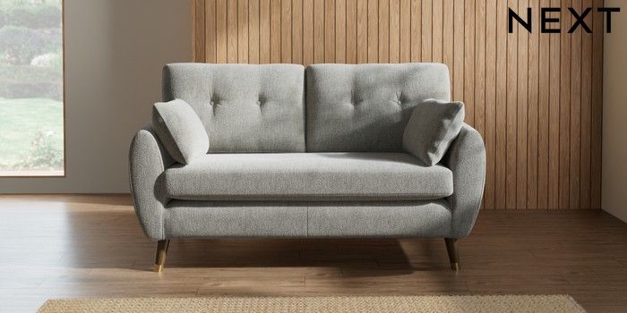 7.2.10 Buy Wilson Buttoned Back 2 Seater Sofa Chunky Chenille Light Grey Low Retro Tapered Metal Cap - Mid from the Next UK online shop Click here to use our accessible website