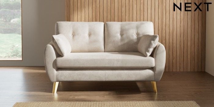 7.2.10 Buy Wilson Buttoned Back 2 Seater Sofa Plush Chenille Oyster Metal Tapered - Gold from the Next UK online shop Click here to use our accessible website