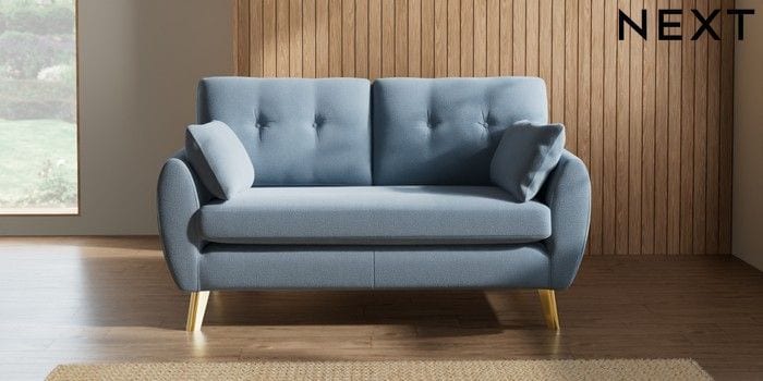 7.3.1 Buy Wilson Buttoned Back 2 Seater Sofa Relaxed Linen Look Mid Blue Metal Tapered - Gold from the Next UK online shop Click here to use our accessible website