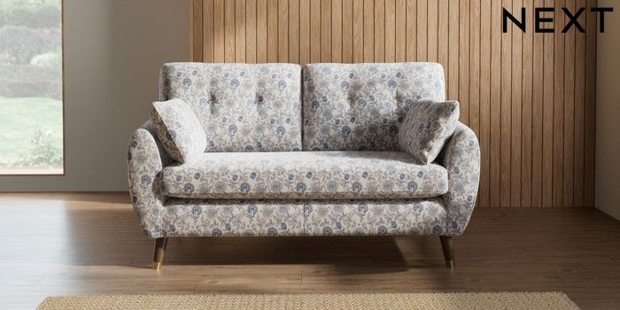 7.2.10 Buy Wilson Buttoned Back 2 Seater Sofa Relaxed Linen Look Print Woodblock Floral Blue Low Retro Tapered Metal Cap - Mid from the Next UK online shop Click here to use our accessible website