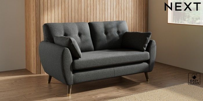 7.3.1 Buy Wilson Buttoned Back 2 Seater Sofa Tweedy Blend Easy Clean Charcoal Grey Low Retro Tapered Metal Cap - Mid from the Next UK online shop Click here to use our accessible website