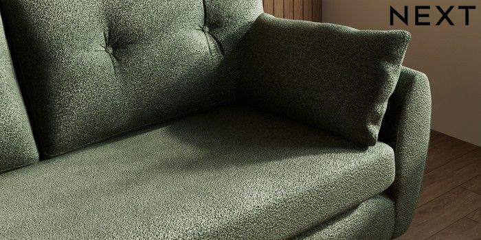 7.3.1 Buy Wilson Buttoned Back 3 Seater Small Sofa Boucle Chenille Dark Moss Green Low Retro Tapered Metal Cap - Mid from the Next UK online shop Click here to use our accessible website