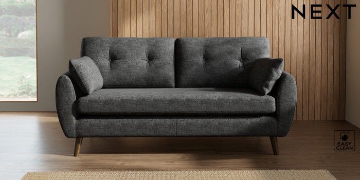 7.2.10 Buy Wilson Buttoned Back 3 Seater Small Sofa Boucle Weave Easy Clean Charcoal Grey Retro Tapered - Mid from the Next UK online shop Click here to use our accessible website