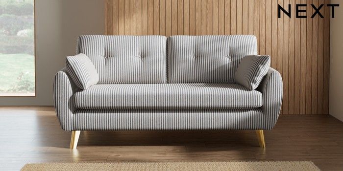 7.2.10 Buy Wilson Buttoned Back 3 Seater Small Sofa Chenille Stripe Slate Blue Metal Tapered - Gold from the Next UK online shop Click here to use our accessible website