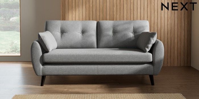 7.2.10 Buy Wilson Buttoned Back 3 Seater Small Sofa Chunky Weave Mid Grey Retro Tapered - Dark from the Next UK online shop Click here to use our accessible website