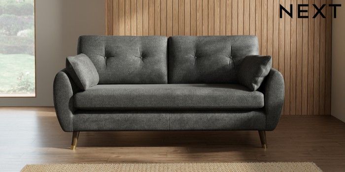 7.2.10 Buy Wilson Buttoned Back 3 Seater Small Sofa Plush Chenille Dark Grey Low Retro Tapered Metal Cap - Mid from the Next UK online shop Click here to use our accessible website
