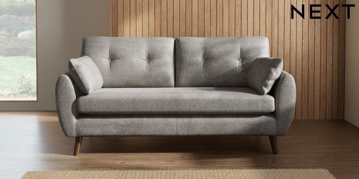 7.2.10 Buy Wilson Buttoned Back 3 Seater Small Sofa Plush Chenille Light Grey Retro Tapered - Mid from the Next UK online shop Click here to use our accessible website