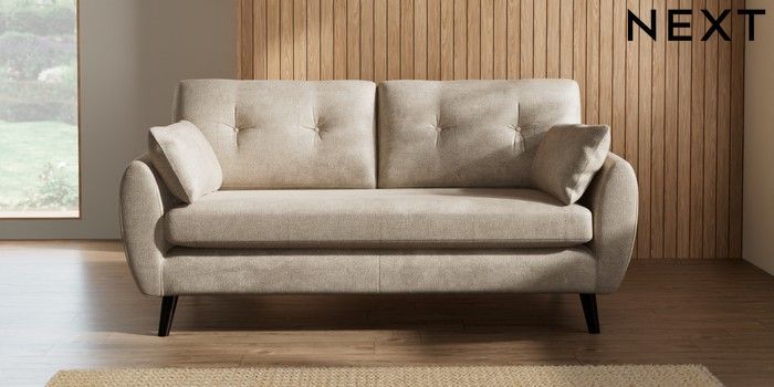 7.2.10 Buy Wilson Buttoned Back 3 Seater Small Sofa Plush Chenille Light Natural Retro Tapered - Dark from the Next UK online shop Click here to use our accessible website