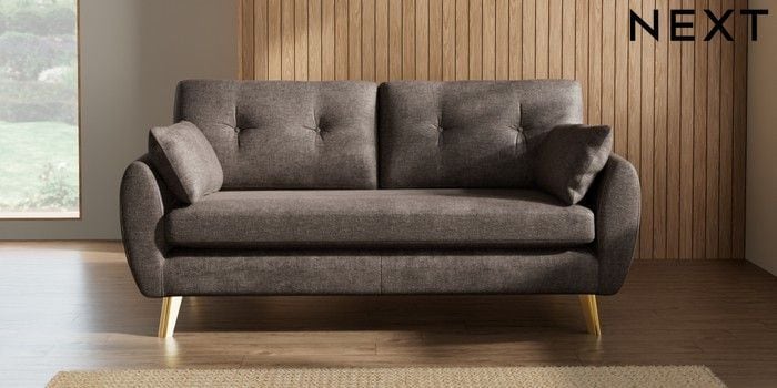 7.3.1 Buy Wilson Buttoned Back 3 Seater Small Sofa Plush Chenille Mink Brown Metal Tapered - Gold from the Next UK online shop Click here to use our accessible website