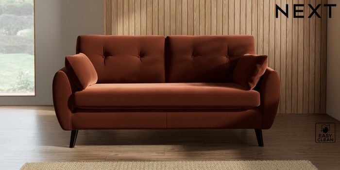 7.3.1 Buy Wilson Buttoned Back 3 Seater Small Sofa Plush Velvet Easy Clean Ginger Orange Retro Tapered - Dark from the Next UK online shop Click here to use our accessible website