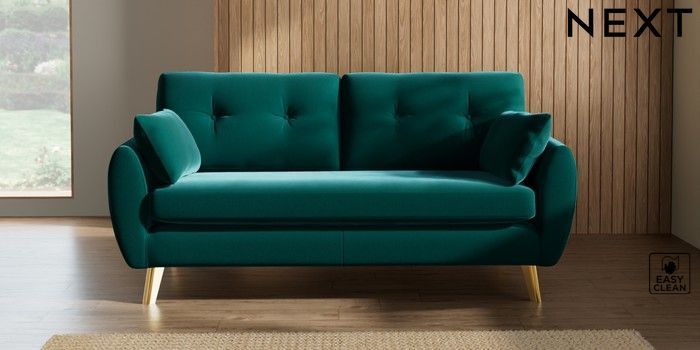 7.3.1 Buy Wilson Buttoned Back 3 Seater Small Sofa Plush Velvet Easy Clean Juniper Green Metal Tapered - Gold from the Next UK online shop Click here to use our accessible website