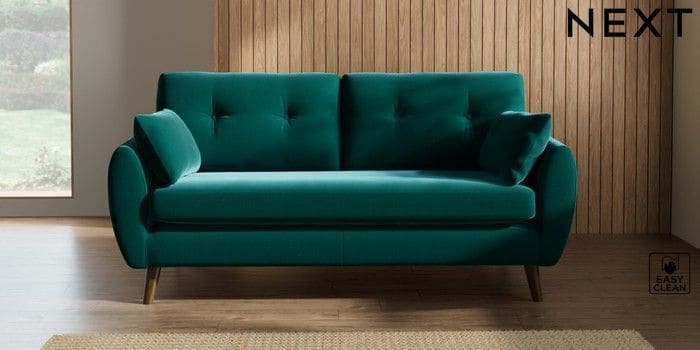 7.3.1 Buy Wilson Buttoned Back 3 Seater Small Sofa Plush Velvet Easy Clean Juniper Green Retro Tapered - Mid from the Next UK online shop Click here to use our accessible website