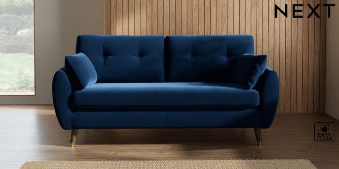 7.3.1 Buy Wilson Buttoned Back 3 Seater Small Sofa Plush Velvet Easy Clean Navy Blue Low Retro Tapered Metal Cap - Mid from the Next UK online shop Click here to use our accessible website