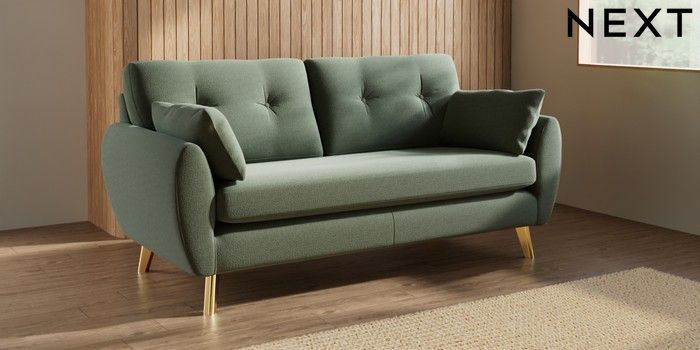 7.3.1 Buy Wilson Buttoned Back 3 Seater Small Sofa Relaxed Linen Look Dark Green Metal Tapered - Gold from the Next UK online shop Click here to use our accessible website