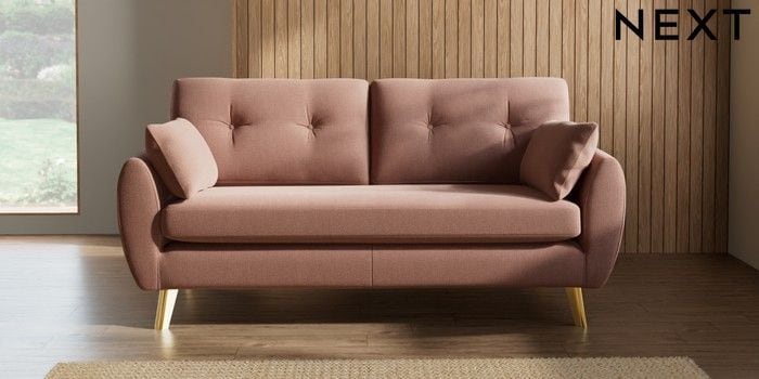 7.3.1 Buy Wilson Buttoned Back 3 Seater Small Sofa Relaxed Linen Look Light Rust Brown Metal Tapered - Gold from the Next UK online shop Click here to use our accessible website