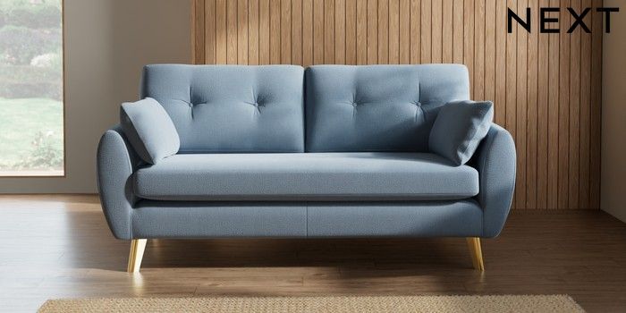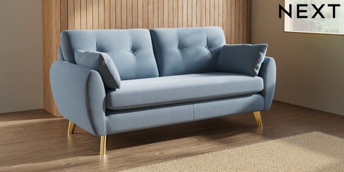7.3.1 Buy Wilson Buttoned Back 3 Seater Small Sofa Relaxed Linen Look Mid Blue Metal Tapered - Gold from the Next UK online shop Click here to use our accessible website