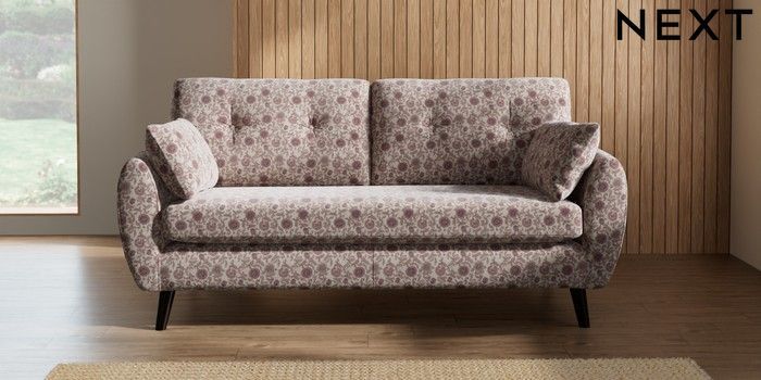 7.2.10 Buy Wilson Buttoned Back 3 Seater Small Sofa Relaxed Linen Look Print Woodblock Floral Print Pink Retro Tapered - Dark from the Next UK online shop Click here to use our accessible website