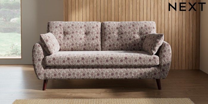 7.2.10 Buy Wilson Buttoned Back 3 Seater Small Sofa Relaxed Linen Look Print Woodblock Floral Print Pink Retro Tapered - Dark Brown from the Next UK online shop Click here to use our accessible website