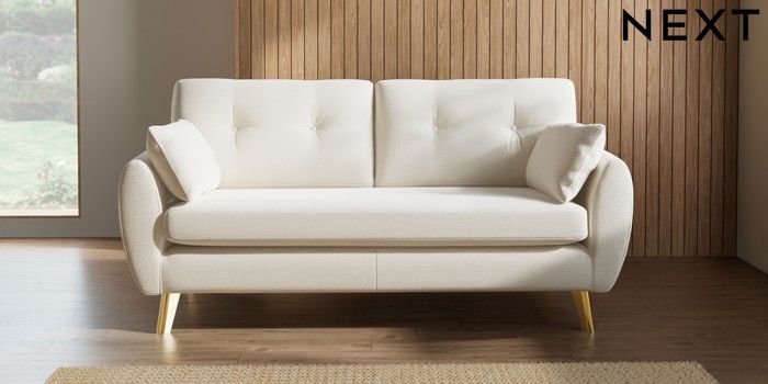 7.3.1 Buy Wilson Buttoned Back 3 Seater Small Sofa Ripple Chenille Oyster Metal Tapered - Gold from the Next UK online shop Click here to use our accessible website