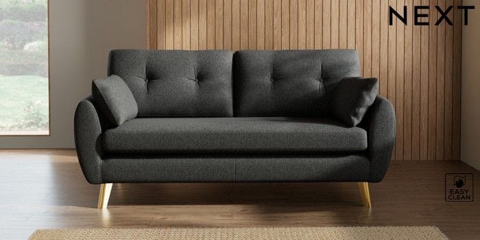 7.3.1 Buy Wilson Buttoned Back 3 Seater Small Sofa Tweedy Blend Easy Clean Charcoal Grey Metal Tapered - Gold from the Next UK online shop Click here to use our accessible website
