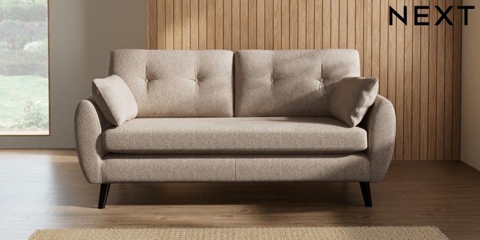 7.2.10 Buy Wilson Buttoned Back 3 Seater Small Sofa Tweedy Chenille Mid Natural Retro Tapered - Dark from the Next UK online shop Click here to use our accessible website