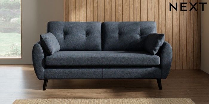 7.2.10 Buy Wilson Buttoned Back 3 Seater Small Sofa Tweedy Chenille Navy Blue Retro Tapered - Dark from the Next UK online shop Click here to use our accessible website