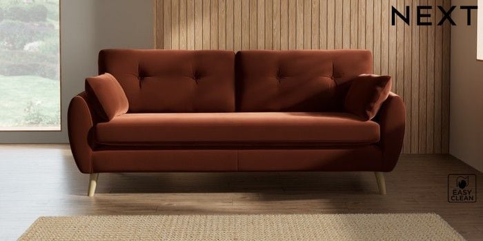 7.2.10 Buy Wilson Buttoned Back 3 Seater Sofa Plush Velvet Easy Clean Ginger Orange Retro Tapered - Light from the Next UK online shop Click here to use our accessible website