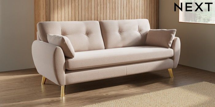 7.3.1 Buy Wilson Buttoned Back 3 Seater Sofa Relaxed Linen Look Mid Natural Metal Tapered - Gold from the Next UK online shop Click here to use our accessible website
