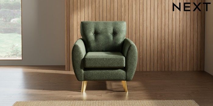 7.3.1 Buy Wilson Buttoned Back Armchair Boucle Chenille Dark Moss Green Metal Tapered - Gold from the Next UK online shop Click here to use our accessible website