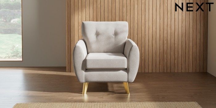 7.3.1 Buy Wilson Buttoned Back Armchair Chunky Chenille Oyster Metal Tapered - Gold from the Next UK online shop Click here to use our accessible website