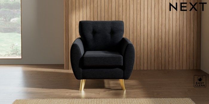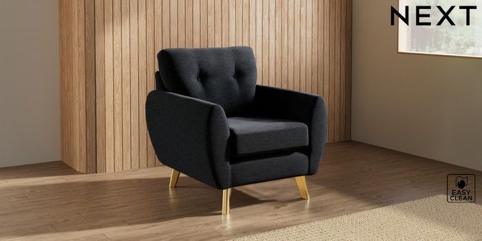 7.3.1 Buy Wilson Buttoned Back Armchair Fine Chenille Easy Clean Black Metal Tapered - Gold from the Next UK online shop Click here to use our accessible website