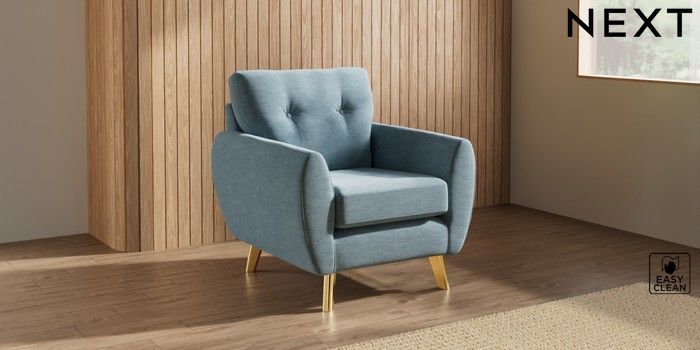 7.3.1 Buy Wilson Buttoned Back Armchair Fine Chenille Easy Clean Mid Blue Metal Tapered - Gold from the Next UK online shop Click here to use our accessible website
