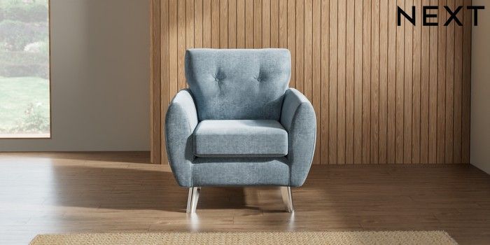 7.2.6 Buy Wilson Buttoned Back Armchair Plush Chenille Light Blue Metal Tapered - Chrome from the Next UK online shop Click here to use our accessible website