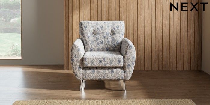 7.2.10 Buy Wilson Buttoned Back Armchair Relaxed Linen Look Print Woodblock Floral Blue Metal Tapered - Chrome from the Next UK online shop Click here to use our accessible website