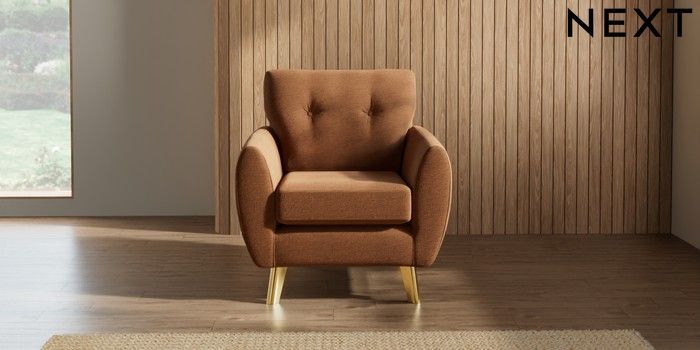 7.2.10 Buy Wilson Buttoned Back Armchair Ripple Chenille Mid Rust Brown Metal Tapered - Gold from the Next UK online shop Click here to use our accessible website