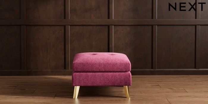 7.2.10 Buy Wilson Buttoned Back Footstool Cotswold Chenille Dark Raspberry Pink Metal Tapered - Gold from the Next UK online shop Click here to use our accessible website