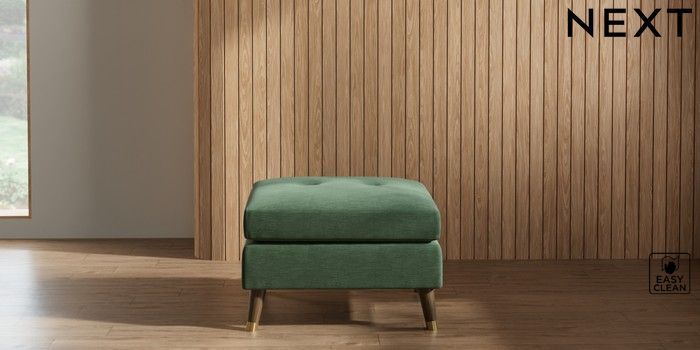 7.2.10 Buy Wilson Buttoned Back Footstool Fine Chenille Easy Clean Mid Khaki Green Low Retro Tapered Metal Cap - Mid from the Next UK online shop Click here to use our accessible website