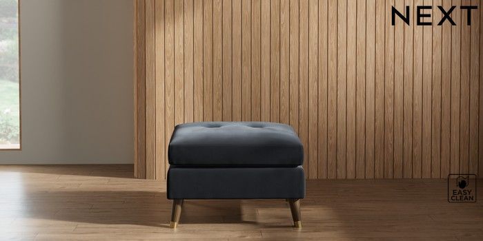 7.2.10 Buy Wilson Buttoned Back Footstool Plush Velvet Easy Clean Charcoal Grey Low Retro Tapered Metal Cap - Mid from the Next UK online shop Click here to use our accessible website