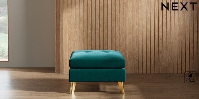 7.2.10 Buy Wilson Buttoned Back Footstool Plush Velvet Easy Clean Juniper Green Metal Tapered - Gold from the Next UK online shop Click here to use our accessible website