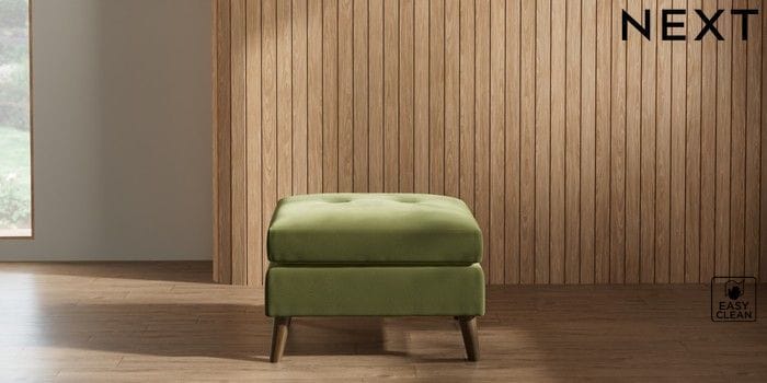 7.2.10 Buy Wilson Buttoned Back Footstool Plush Velvet Easy Clean Mid Olive Green Retro Tapered - Mid from the Next UK online shop Click here to use our accessible website