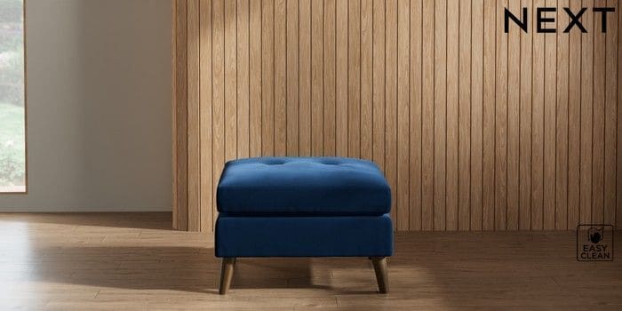 7.2.10 Buy Wilson Buttoned Back Footstool Plush Velvet Easy Clean Navy Blue Retro Tapered - Mid from the Next UK online shop Click here to use our accessible website