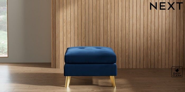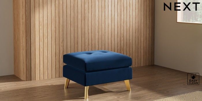7.3.1 Buy Wilson Buttoned Back Footstool Plush Velvet Easy Clean Navy Blue Metal Tapered - Gold from the Next UK online shop Click here to use our accessible website
