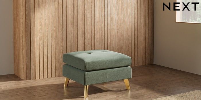 7.3.1 Buy Wilson Buttoned Back Footstool Relaxed Linen Look Dark Green Metal Tapered - Gold from the Next UK online shop Click here to use our accessible website