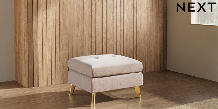 7.3.1 Buy Wilson Buttoned Back Footstool Relaxed Linen Look Mid Natural Metal Tapered - Gold from the Next UK online shop Click here to use our accessible website