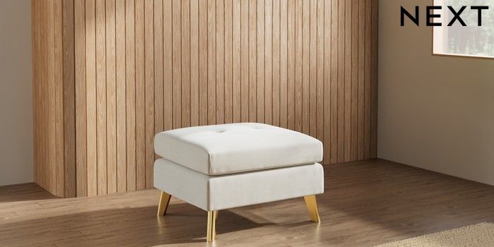 7.3.1 Buy Wilson Buttoned Back Footstool Relaxed Linen Look Oyster Metal Tapered - Gold from the Next UK online shop Click here to use our accessible website
