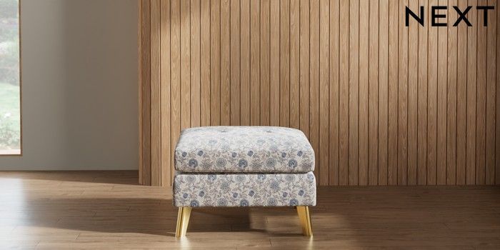 7.2.10 Buy Wilson Buttoned Back Footstool Relaxed Linen Look Print Woodblock Floral Blue Metal Tapered - Gold from the Next UK online shop Click here to use our accessible website